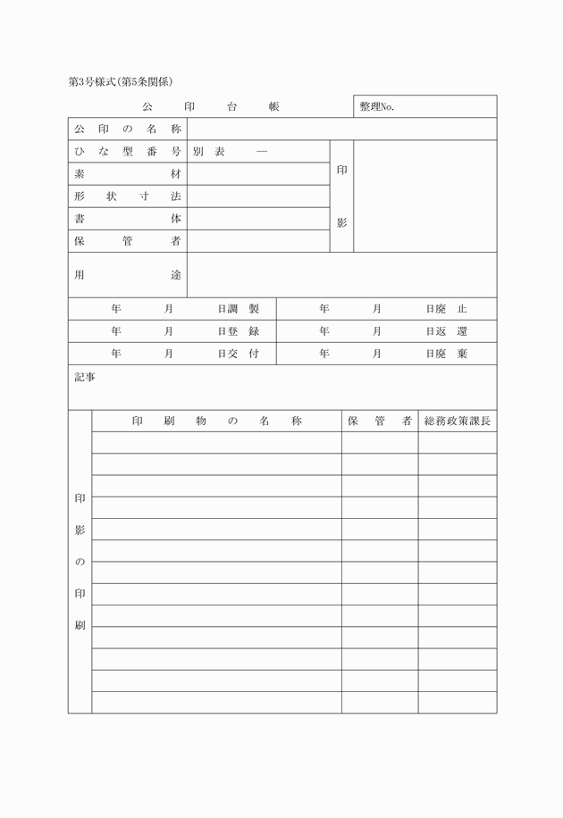 第5条 総務政策課長は、公印台帳(第3号様式)を備え、公印の新調、改刻又は廃止のつど必要事項を記入し整理しなければならない。