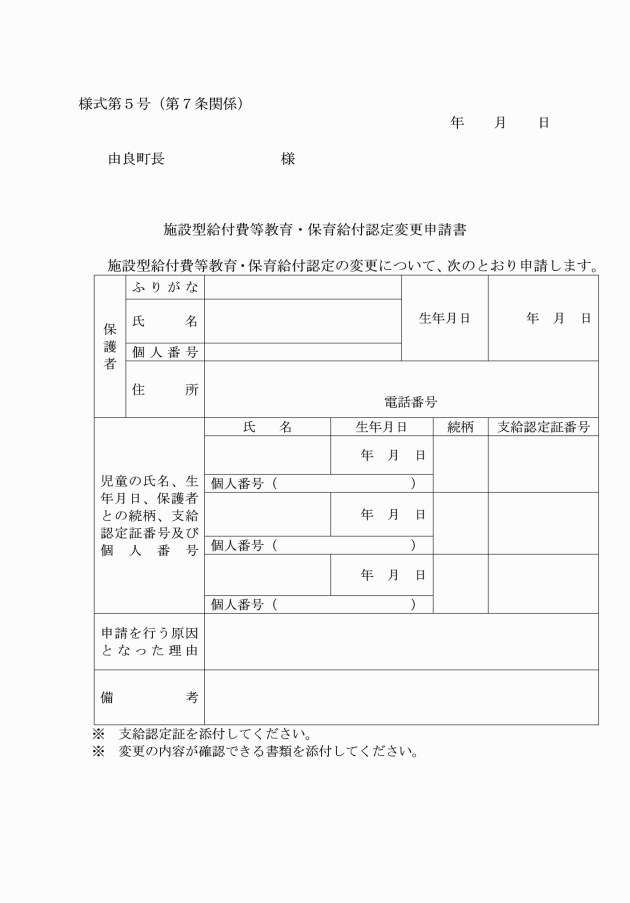 第7条 府令第11条第1項の申請書は、施設型給付費等教育・保育給付認定変更申請書(様式第5号)とする。